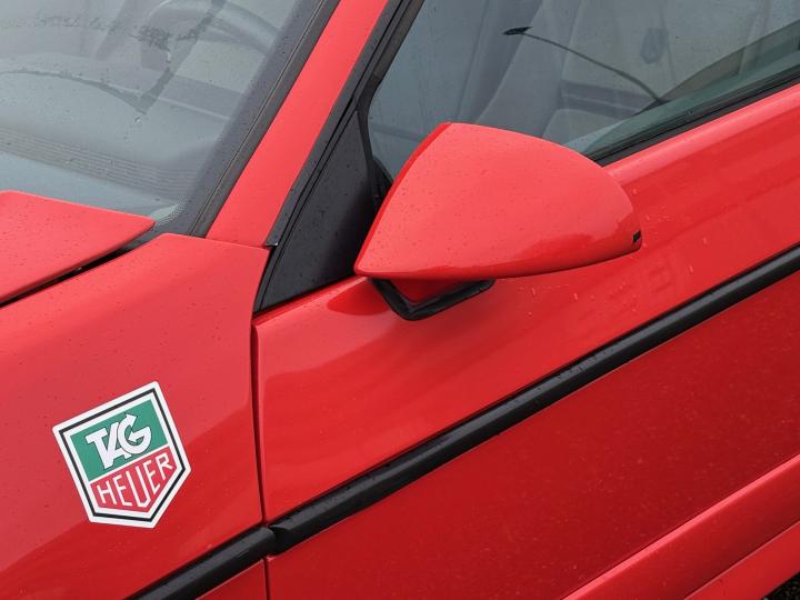 Rood met een grijs stoffen interieur.